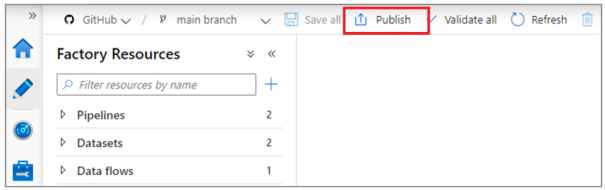 Data Factory の画面から 操作できる。 mainブランチ → 発行ブランチ へ資材の反映ができる。
